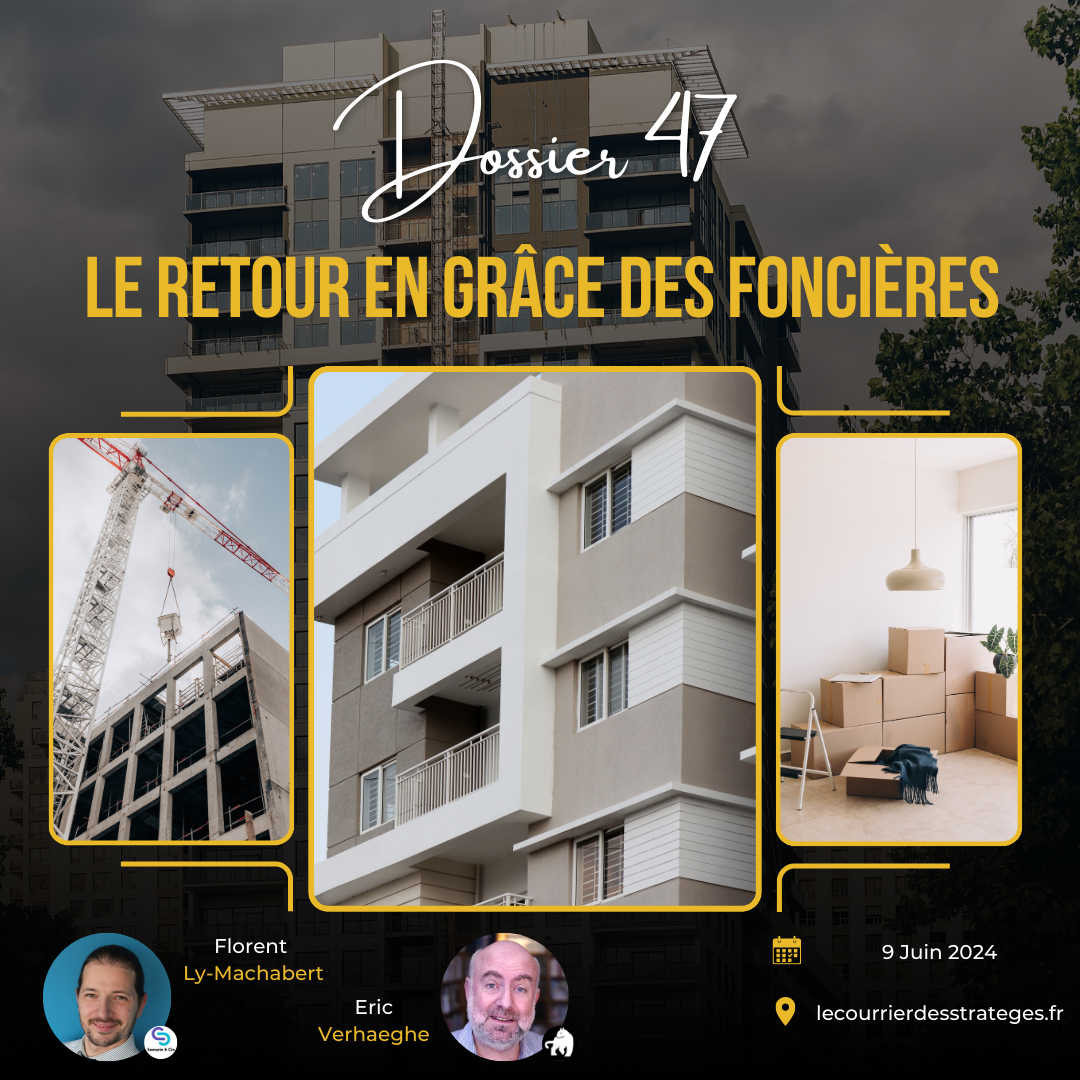 Retrouvez notre 47ème dossier, disponible sur le site du Courrier de stratèges ! Après avoir posé les bases de notre stratégie (cliquez ici), puis abordé l’or, les métaux blancs, les matières premières, l’art-investissement, le secteur non coté, les devises étrangères, les actions françaises, les cryptoactifs, les obligations souveraines, l’assurance-vie, l’entreposage physique de l’or, la nature-investissement, les SCPI, la pierre et l’immobilier alternatif, les lois de défiscalisation immobilière, la débancarisation en cryptos, la gestion en bon père de famille et l’optimisation successorale, les principales stratégies de désendettement, la situation d’Air Liquide, la fiscalité des cryptos, le mode d’emploi des actions en bourse, l’achat d’or en période de crise et de guerre, la préparation de sa retraite, les banques digitales et autres courtiers en ligne, le Plan d’Épargne Logement (PEL), les ETF, les produits structurés, l’Impôt sur la Fortune Immobilière, les opportunités d’investissement en Inde, les actions et obligations émergentes, les opportunités d’investissement au Japon, les enchères, notamment immobilières, la négociation d’un crédit immobilier en 2024, une mise à jour du portefeuille d’actions que nous vous avions proposé dans le dossier N°8, une rétrospective des 23 dossiers parus en 2023, la création de rentes, la transmission du patrimoine sans en perdre le contrôle, les SCI, les stratégies légales d’évitement d’un contrôle fiscal, l’hydrogène, les labels ESG, les investissements santé, le match du long terme entre classes d’actifs, les nouveautés de l’impôt sur le revenu 2024 et l’or comme actif vert, nous consacrons ce douzième dossier de l’année au retour en grâce des foncières.