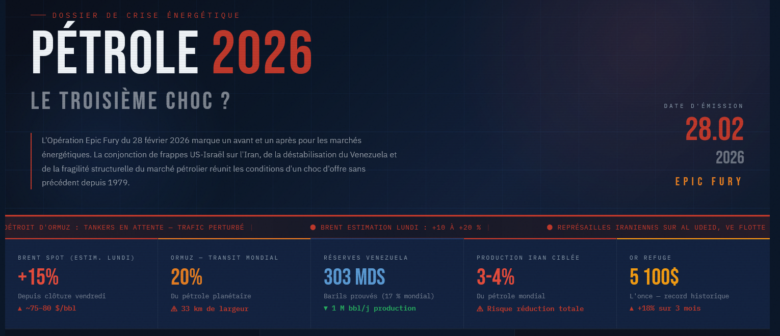 Ce 28/02/2026, au moment même où nos analystes rédigent ces lignes, les États-Unis et Israël ont lancé une opération militaire d’envergure inédite contre l’Iran, officiellement désignée par le Pentagone sous le nom Opération Epic Fury.